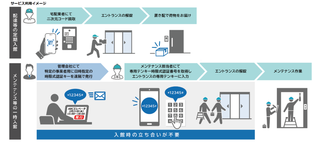 「直達®」は、時限認証キーを用いて共用部オートロックを解錠し、提携事業者(宅配事業者等)のみを入館させることができるサービスです。